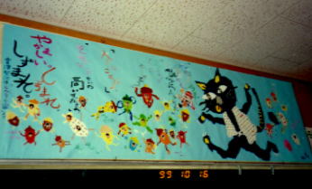 6年生のクラスの子どもたちで作った共同製作の「ちぎり絵」です。およそ一時間ほどで仕上がりました。教室の正面に掲示しました。ひとつひとつのどんぐりには、一人一人の子どもの顔写真を貼りました。詳しくは「TOSSトークライン」(NO.164)を参照してください。酒井先生が紹介してくださっています。