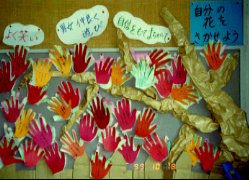 あとは、葉や花に見立てて、毎月お題を変えた手形やカードを貼り重ねていくというわけである。