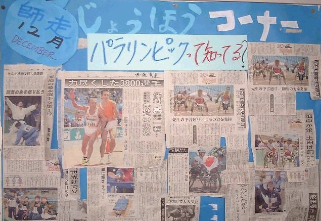 マル得じょうほうコーナーには、その季節その時期の新聞記事をトピックにして貼り付けている。時折子供たちが関連記事を家から持ってきて、自由に貼ったりもしている。(左下図)