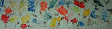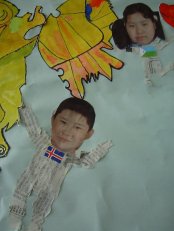 | ⑦できあがり〜ワンポイントでちょっぴり味付け デジカメで撮っておいた個々の顔写真を自分の人形(ひとがた)に貼り付けて出来上がり! (ある子が、ポスターから切り取った世界の国旗を胸の部分に糊付けしていたのを見て、全員「ぼくもわたしも」ってことで国旗を貼り付けていました。 かくして多国籍の「Wee are the world」が出来上がりました。) 作品に上手い下手はありません。壁画を見上げる子供たちの表情は、どの子も満面の笑みでした。 |