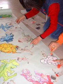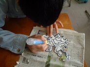 | ⑥はる〜周囲をおさえる 貼ったものは端や周りからはがれてくるのです。 したがって、周りをしっかりおさえながら、きちんと貼らせます。 また、子供たちは、配置・形を自由に楽しみながら活動していました。 |