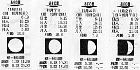 これは、「月出」の時刻を見ることで、夕方に昇る月は、満月か満月に近い月という事が分かる。