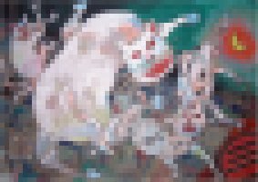 なんの絵なんでしょうね。 やねの上になにかいるよ。 生きものが5ひきいるみたいだよ。 マウスポインタを絵の上におくとわかるよ。