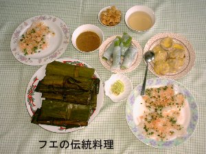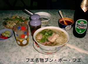 日本人に人気のあるのはフォーという米でつっくた麺のベトナム風うどんです。最近ではベンタイン市場の隣にできた「フォー2000」という店に人気があります。このフォーというのはたいてい自分の家で作るのではなく、フォーの専門の屋台で食べられています。その理由は、スープにあります。フォーのスープは牛の骨やいくつかの香采を使って作られるのですが、長時間煮込んだものでなくては本格的なフォーの味が出ないからです。甘味を出すために大根を一緒に煮込んだりします。この大根は美味しいと私は思うのですが、ベトナム人はこの大根をあまり食べないようです。出来上がったスープに麺を入れて、もやしと、牛肉の薄切りか鶏肉を入れて食べます。スープにライムをかけて食べたりもします。ベトナム人の朝食の定番です。 南部の料理でウナギのスープというのがあるのですが、真ん中に穴のあいたタイのトムヤンクンと同じ鍋を使ってウナギを一匹まるごとつっこみます。(カインチュアという名の料理です)そこに唐辛子とお酢を入れます。香料の葉っぱを入れ、キュウリとパイナップルを一緒に入れて煮るのですが、初めて食べたときは少し複雑な気分になりました。一つ一つの素材を日本で食べればそれなりに美味しくいただける物ですが、出来上がったときの味は辛くて、すっぱくてこのような物を口にして良いのだろうかと良心の呵責を感じてしまうほどの味なのですが、慣れると暑さに良く効く味付だとわかって、癖になってしまうところがベトナム料理の不思議なところです。
