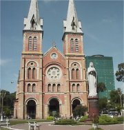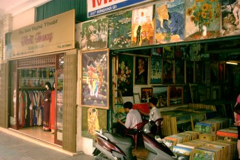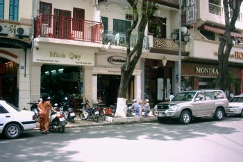 ドンコイ通りを歩くには初めにノートルダム教会へ行くことになります。ノートルダム教会は市の中心地にあるので初めての人にでも簡単にそこに行くことができます。タクシーに乗ってホーチミン市郵便局と告げてもかまいません。市の郵便局の隣にあるからです。ドンコイ通りの大きな交差点のロータリーにフランス式ゴシック様式の教会がど〜んと建っています。ここは観光客の集まる場所なので、それを目当てにしたお土産グッズ売りの屋台がたくさん出ています。また、シクロやホンダオムのおじさんたちもたくさんたむろして、お客を待っています。 シクロやホンダのお兄さんを見ると、どうしても私はカメラを向けたくなるのですが、なかなかどうして、いきなりカメラを向けると逆にこちらのほうを睨んでくるので、小心な私には、うかつにカメラを向けることはできません。少し離れた場所で望遠レンズなどを使うことになります。 西洋人のグループ旅行などにであうと、彼ら、彼女らが陽気に大声で「ビューティフル!!」とか言いながら平気でカメラをむけて写真を撮って行くのを見ると、観光旅行はこうでなくっちゃ…とひそかに羨ましくおもったりすることもあります。 フランスのアールデコ様式の郵便局なども一通りカメラに収めた頃に、先ほどから私に目をつけていた、お土産売りの子供たちや、シクロやバイクタクシーのお兄さんからの、しつこさ200%の勧誘攻撃がはじまります。この攻撃をしのぐためには、ひたすら歩きだすしかありません。ドンコイ通りの歩き方の一歩は、お土産売りから逃げて歩き出すということになりました。ドンコイ通りはノートルダム教会から、サイゴン川に一直線に向かっています。 きれいに植木が植わった歩道を歩きながらしつこいホンダオム(バイクタクシー)の勧誘を退けます。一区画くらい歩いたところで、たいていしつこい勧誘は終わりを告げるでしょう。 言い忘れていましたが、ホーチミンの通りを歩くということは、30℃以上の炎天下を、日差しを帽子で防ぎながら、汗をかきかき歩くことになります。けっして原宿や心斎橋通りをのんびりしながら歩いているのと同じように想像しないでください。とにかく暑いということを想像しながらこの文章を読んでください。 …ということで、一区画歩くと左手にCHUというバーがある区画にでます。店の前の交差点の左手に小さな公園とがあります。このあたりにはベトナム絵画のギャラリーや彫刻家のギャラリーがあります。ベトナムの絵画は、伝統的なものも好きですし、現代的な抽象画なども、結構味があって面白いです。掘り出し物がないかどうか少し見てまわることをお勧めします。 ![]() すこしギャラリーを冷やかした後で、ドンコイ通りを下って行くと、右側にお土産ショップが立ち並んでいます。観光客がよくアオザイのオーダーメードをするショップもここにあります。 もう少し通りを下ると左側にサイゴンのホテルの老舗であるコンチネンタルホテル、右側に大きな書店があります。この本屋さんは、外国人向けの観光案内書や英語、中国語、ほんの時たま日本語の本がおいてあります。また、CDやビデオなども扱っていて、長期滞在者にとっては、非常にありがたい場所となっています。私はベトナム歌謡曲の歌詞本を買ってカラオケの練習などに精を出していたりしました。 本屋を過ぎて少し行くとレストランが角に現れて、市の音楽堂のまえの大きなロータリーに差し掛かります。じつはこのありは泥ボーが多いことで知られています。この角から先、フンセンホテルとキャセイ航空のオフィスまでの間は、特に観光土産ショップや、両替所、貴金属ショップなどが並び、外国人が多い場所で、それを狙った引ったくりが頻繁に出没するのです。私も何度となくかばんをひったくられそうになりました。したがって、ここでは自分のバックを特に胸の前に抱きかかえるくらいの用心で、歩くことにします。 外国人観光客を多く見かけるこのあたりにはベトナム雑貨のショップがずらりと並んでいます。ベトナムのシルク製品、バッグ、民芸品、漆加工品などの専門店が並びます。 ![]() フンセンホテルの前の角には、ベトナム宮廷料理で有名なベトナムハウスが黄色いレンガの壁を見せています。このお店のオーナーは、フォー2000という有名なベトナムうどんのお店のオーナーにもなっています。どちらのお店も、清潔さと、料理のおいしさで人気があります。 中型ホテルのボンセンホテルやフンセンホテルの並ぶ区画を過ぎると、サイゴンの新しいショッピングセンターができている場所に差し掛かります。日本語の看板も目に付きます。どうやら日本人オーナーのショップもあるようです。いろいろショップを眺めつつ、道沿いにあるカフェで小休止するのも良い考えです。このショッピングセンター内には足裏マッサージがありました。でも足裏マッサージって、もともとベトナムに