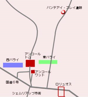 ![]() ■バンテアイ・スレイ遺跡 ![]() アンコール遺跡との位置関係図 アンコール遺跡群から北東におよそ30km離れた場所に位置するバンテアイ・スレイ遺跡は美しいバラ色の砂岩で造られた3つの祠堂が特徴の遺跡です。車でおよそ1時間の距離にあります。 ラージェンドラヴァルマン2世の側近のヤジュニャヴァラーハにより967年に建設されたもので、シヴァとヴィジュヌ神が祭られています。 東門の入り口を通ると、ラテライトの石畳が敷きつめられた参堂になっています。参堂の両脇には石柱が並び、壕を越えて祠堂のある中心部に到達するように造られています。 祠堂は美しいレリーフで装飾され、壁面には「東洋のモナリザ」と呼ばれるほどの美しい女神がレリーフ彫刻されています。若き日のアンドレ・マルローがこのレリーフを盗み出そうとした事件は有名です。現在は第三周壁の内側は立ち入りが禁止されていますので、このレリーフは進入禁止のロープ越しに見学することになります。 ![]() 注)アンドレ・マルロー:フランスの小説家であり、冒険家。「人間の条件」などの作品があります。1923年カンボジアへ探険に出かけ、バンテアイ・スレイの遺跡から女神のレリーフを盗み出し、カンボジアの警察に捕まり、禁固3年の刑になりますが、フランスの友人たちの運動で釈放されフランスへ帰国しました。このときの経験を小説にしたのが「王道」です。 |