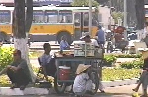 ベンタン市場の前でたたずむ人々。