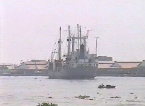 川に沿ってここから海まで延々と貨物船の列が続いているのです。