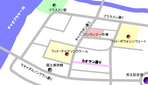 ![]() ■カオサン通り周辺案内 ![]() 王宮の北に位置し国立博物館のすぐ北側、民主記念塔の東にあるカオサン通り周辺は、バックパッカー御用達の安宿街になっています。安宿の周りには、雑貨屋、みやげ物屋、ネットカフェなど廉価なショップが集まっています。格安航空券を扱う旅行代理店や格安食堂などもあり、旅行者には便利な場所になっています。 ワット・ボウォンニウェートはタイ仏教のタンマユット派の本山で、プミポン国王が修行をした場所として有名です。その西隣にはバランプーデパートと、その隣にバランプー市場があり、野菜や魚介類、肉などの食品や、衣料品、日用雑貨など、庶民の市場としてにぎわっています。また、国立博物館にはタイの芸術家による現代アートなどが展示されています。 特にバックパッカーでなくても、機会があれば訪れてノンビリと歩いてみたい場所だと思います。 ![]() |