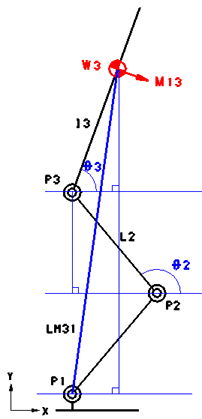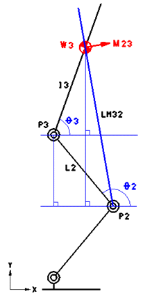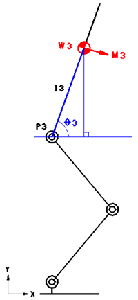 ■胴体の重心W3によるモーメントM13 胴体の重心W3によるモーメントM13は、さきほどよりも、もうちょっと複雑ですが、基本的な考え方は一緒です。足首からW3までの直線距離LM31と、W3の座標を求めます。 X方向の距離 W3X=L1・cosθ1+L2・cosθ2+l3・cosθ3 Y方向の距離 W3Y=L1・sinθ1+L2・sinθ2+l3・sinθ3 LM31の長さはピタゴラスの定理より LM31 = √(W3X2 + W3Y2) となります。 あとは先ほどと同じように、水平線の基準0°に対するLM31の傾きをθとすると cosθ = W3X / LM31 の関係が成り立ちますので、モーメントの式に当てはめると、 M13 = W3・LM31・W3X / LM31 M12 = W3・W3X [Kgf・cm] で求まることになります。書き直すと M13=W3・(L1・cosθ1+L2・cosθ2+l3・cosθ3)[Kgf・cm] になります。 |