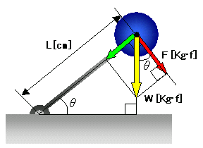 重りが付いている棒と地面の間の角度をθ[度]とします。 重りは地面に対して垂直に落ちようとしますが、棒が邪魔でまっすぐに落ちず、棒を半径とした円軌道を描いて落ちます。この時、重りが垂直に落ちようとする力W[Kg・f]は、円軌道の接線方向に落ちようとする力F[Kg・f]と、棒を支点方向に押し返す力に分解して考えることができます。 ここで、円軌道の接線方向に落ちようとする力F[Kg・f]は、棒を回転させようとする力であると言うことができます。 |