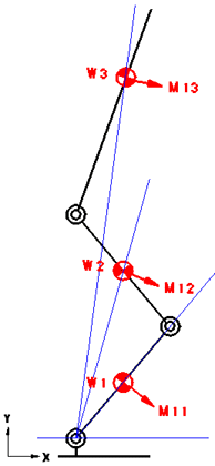 足首の関節には、スネとモモと胴体の重心全てのモーメントが掛かります。足首に掛かる全てのモーメントをM1とした場合、 スネの重心 W1によるモーメントをM11 モモの重心 W2によるモーメントをM12 胴体の重心 W3によるモーメントをM13 とすると、 足首のモーメントM1 = M11 + M12 + M13 で算出できます。 重心W2やW3は、ヒザや腰などの関節でウネウネ曲がりながら支えられています。そんな重心のモーメントはどうやって求めるのでしょう? 例えば重心W2はヒザに支えられて足首にその重さが伝わっています。ということは、やはりヒザの関節を経由した力の伝達を考えないといけないのでしょうか?いえいえ、そんなことはありません。重心W2から基準となる足首までまっすぐ直線を引き、その直線を仮想の棒とみなして独立したモーメントの計算を行えば良いのです。 重心W2によるモーメントを計算する場合、ヒザの関節は固定されていると考えます。なので、重心W2をひとつの重りと見なしたとき、足首の関節との相対的な位置関係は変わらないので、どういう経路で固定されていても関係ないのです。これは重心W3についても同じです。 では、各モーメントを順に求めて行きましょう。 |