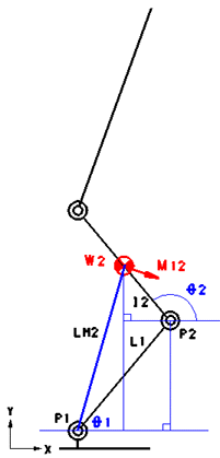 ■モモの重心W2によるモーメントM22 モモの重心W2によるモーメントM22は、始めにご紹介した基本式がそのまま適用できます。 M22 = W2 ・ l2 ・ cosθ2 [Kgf・cm] 左の図ではθ2が90°を超えるので、M22はマイナス方向になります。なので左側に倒れようとする力となります。これも簡単ですね。 |
