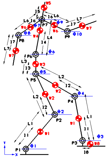 左図がそのモデルです。今回はちょっと調子に乗って、腰の自由度を増やして両腕と頭を追加してみました。(^^ 両脚、両腕の長さと重心位置と重量は左右同じとしています。 W1:スネの重量[Kg] L1:スネの長さ[cm] l1:スネの重心位置[cm] W2:モモの重量[Kg] L2:モモの長さ[cm] l2:モモの重心位置[cm] W3腰の重量[Kg] L3:腰の長さ[cm] l3:腰の重心位置[cm] W4:胸部の重量 L4:胸部の長さ[cm] l4:胸部の重心位置[cm] W5:頭部の重量[Kg] l5:頭部の重心位置[cm] W6:上腕部の重量[Kg] L6:上腕部の長さ[cm] l6:上腕部の重心位置[cm] W7:前腕部の重量[Kg] L7:前腕部の長さ[cm] l7:前腕部の重心位置[cm] W8:足の重量[Kg] l8:足の重心位置[cm] |
