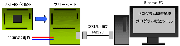 AKI-H8/3052Fマイコンボードは、それだけでは何もできない、ただの板っぺらです。マイコンなのでプログラムを作って送り込んであげて、はじめて動き出すものです。そのための開発環境として、以下の設備が必要です。