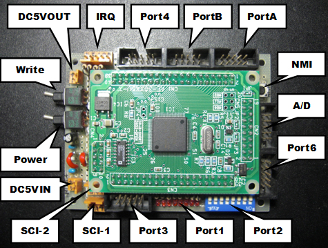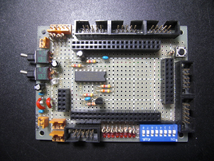 ここでは、AKI-H8/3052Fマイコンボードを搭載するための小型マザーボードを自作したのでご紹介します。秋月純正のマザーボードは学習用途が中心のマザーボードという色が強く、少しサイズが大きすぎでした。今回製作したマザーボードはCPUの主要な機能やポートを外部に取り出すための簡単な基板ですが、AKI-H8/5052Fマイコンボードよりもひと回り大きいだけなので、ターゲットへの組み込みがしやすくなります。このマザーボードは2001年10月にAKI-H8/3048Fマイコンボード用に製作したものですが、今回はAKI-H8/3052Fマイコンボード用としてDC+5V単一電源仕様に改造したものです。 1.AKI-H8/3052Fマザーボードの外観 下の写真が製作した小型マザーボードです。まんなかに乗っているのがAKI-H8/3052Fマイコンボードです。AKI-H8/3052Fよりひと回り大きなユニバーサル基板(サンハヤト293)を使い、周辺にスイッチやコネクタ類を並べています。各ポート類は個別に10ピンのコネクタに分けてみました。スペースの関係上コネクタに出せなかったポートもありますが、主要な部分はだいたいサポートしています。