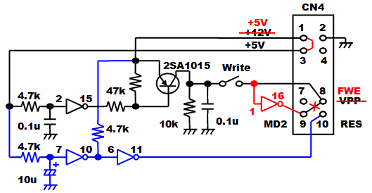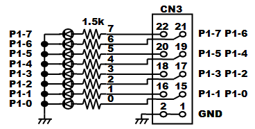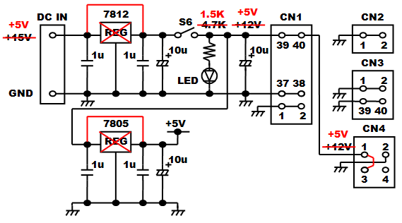2.AKI-H8/3052Fマザーボードの回路 回路といっても新たな回路はひとつもなく、AKI-H8/3052F 秋月開発キットのページでご紹介しているものと同じ電源回路と書込み回路を持ち、動作を設定するためのディップスイッチと簡単なモニタ用の8BITのLEDも、開発キット側につけてあった回路と一緒です。あとは各ポートを10ピンのコネクタに立ち上げているだけです。 しかし、せっかくなのでAKI-H8/3048F用からAKI-H8/3052F用の単一電源仕様に改造した箇所も含めてご紹介しておきましょう。 2−1.電源回路 ![]() AKI-H8/3048F用の場合にはDC+15V程度を外部から供給して、プログラム書き込み用のDC+12Vと、回路動作用のDC+5Vの2電源を作っていました。AKI-H8マイコンボード上にも7805三端子レギュレータが実装されていてDC+5Vが作られますが電力容量が少ないため、周辺に外付けする回路を動作させるためのDC+5Vを上記の7805三端子レギュレータに担当させようとしたものです。 今回、AKI-H8/3052Fマイコンボードはプログラムの書込みも実行も含めてDC+5Vの単一電源仕様になったため、外部から安定したDC+5V電源を直接供給することにしました。しがたって、7812と7805の各三端子レギュレータは不要となるため取り外してジャンパーし、電源供給状態を示すLEDの抵抗値も小さくしています。CN4-1番端子にDC+5V電源が接続される形となりますが、AKI-H8/3052Fマイコンボード上では7805三端子レギュータの入力に接続されています。7805三端子レギュレータの入力にDC+5Vを接続しても安定したDC+5Vは出力されませんので、7805三端子レギュレータの出力が接続されているCN4-3番端子とジャンパーすることで、AKI-H8/3052Fマイコンボード内に安定したDC+5V電源が供給されるようにしています。
