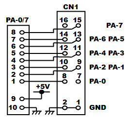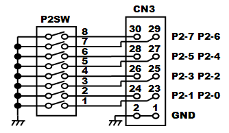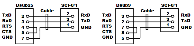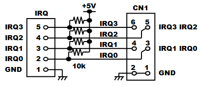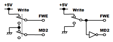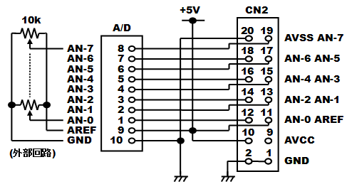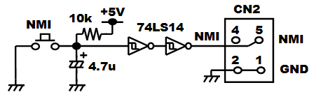 2−2.プログラム書き込みモード回路 ![]() 秋月純正開発キットの回路をベースとし、MD2端子への信号ロジックをインバータで逆にしています。もともとがDC+12Vを電源として書き込みモード信号を生成するための回路構成なので、わざわざトランジスタを使ったりして少し煩雑な回路になっています。また、電源ON後の書き込みモード移行へのタイミングを生成するために抵抗とコンデンサによる時定数を使っていますが、H8/3052Fマイコンチップのハードウェアマニュアルを見ると、どうも厳密には仕様通りになっていないように思われます。 また、上記回路図の青線で書かれている部分がAKI-H8/3052Fマイコンボード用のリセット回路ですが、実はAKI-H8/3052Fマイコンボード上にはもともと専用ICを使ったリセット回路が実装されています。なのでこの青線部分の回路が無くても正常に動作します。例えば外部に電源リセットが必要なデバイスを設けたい場合でも、CN4-10番端子から外部に対してリセット信号が取り出せます。 もろもろ見直すと上記のような面倒な回路は要らず、下記のような単純な回路だけでも動作します。スイッチが上向きの状態が書き込みモードで、下向きの状態がプログラムの実行モードです。 ![]() 左側の回路は2連のスイッチ(Make/Brake接点あり)を使って書き込みモード信号を作っている回路です。電源ON時の書き込みモード移行へのタイミング生成を行っていません。H8/3052Fハードウェアマニュアル上では「電源投入時の不安定な状態のときにFlashメモリの内容が破壊される危険がある」といった主旨の注意があり確かにお勧めはできません。あくまでホビー用途に限定してお使い下さい。なお、秋月電子通商から発売されているAKI-H8/3052F USB開発ボードの回路はこれを採用しています。この回路ではプログラム実行モード時のMD2端子がオープン状態になっていますが、AKI-H8/3052Fマイコンボード上でプルアップされているため問題ありません。 右側の回路は2連スイッチが入手できない場合にインバータを使って同じ機能を実現している例です。インバータにはオープンコレクタのトランジスタアレイを想定しています。 2−3.シリアル通信ポート ![]() 大きなDsubコネクタを使うとスペースがもったいないので、小さな基板用3ピンコネクタを使用しますSCI-1はプログラム書込み用として絶対必要となります。パソコンのシリアルポートと接続するには、以下のような通信ケーブルを製作する必要があります。左がDsub25ピンの場合で、右がDsub9ピンの場合の配線になります。ケーブルの長さはせいぜい2〜3m程度までが無難です。 ![]() 2−4.IRQ入力ポート ![]() IRQはIRQ5までありますが、コネクタの関係からIRQ3まで立ち上げています。外部からの割り込みを受け付けるためのポートです。IRQはPIOのPort8共用になっています。回路上でプルアップしています。 2−5.NMI入力ポート ![]() 最も優先度の高い割り込み処理を発生させるためのポートです。今回のようにスイッチを付けておくと、モニタデバッカで動作させるためのアボート(中断)スイッチとして利用できます。 モニタデバッガのアボートを安定して実行するために簡易的なチャタリング除去を追加しました。チャタリングとはスイッチがON/OFFする時に、接点面の微細な凹凸やバウンドによって10ms程度以上の期間に渡って細かなON/OFFが繰り返されてから安定する現象を言います。高速なON/OFFを検知してしまうマイコンなどの電子回路では、本来望まないON/OFFの繰り返しとして認識されてしまいます。これを回避するため、ヒステリシス特性を持つシュミットトリガのインバータ74LS14と抵抗、コンデンサによって、チャタリングを除去します。 ※本来はコンデンサからの放電時間を設定する抵抗をNMIスイッチとの間に挟みますが、今回手持ちの定数の抵抗では74LS14の入力がLOWに落ちきらなかったため削除し、NMIスイッチによって直接コンデンサの両端がGNDに落ちる回路としました。(2010/04/28追記) 2−6.Port2入力ディップスイッチ ![]() マザーボード上には、色々な動作の設定をさせるためにディップスイッチを付けておくと便利です。今回もPort2をディップスイッチに立ち上げておきます。回路上プルアップしていないため、プログラム上でPort2のPCR(プルアップコントロールレジスタ)の設定が必要です。 2−7.Port1 8BIT LED ![]() マザーボード上には、簡単に動作状態を表示させることができるLEDを設けておくと、動作の監視やデバッグ時などにとても便利です。今回はLEDを直接ドライブすることができるPort1から、抵抗を経由して直接LEDを駆動します。しがたって、プログラム上から「1」を設定すると点灯し、「0」を設定すると消灯します。 2−8.A/D変換入力ポート ![]() A/D変換入力は、ポテンショメータ(ボリューム可変抵抗器)やセンサなどのアナログ値を取り込む場合に使用します。AREF/ACCなどは、本当は外部に出して自由に電圧設定できるようにするのが良いかもしれませんが、今回はDC+5Vに固