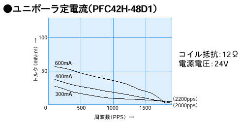 以下は日本パルスモータ製のステッピングモータカタログからの抜粋で、特性グラフの例です。