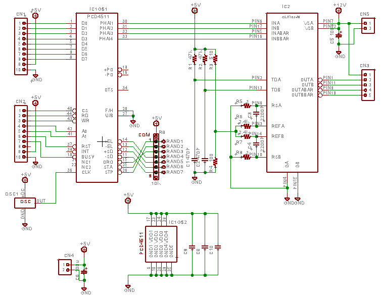 回路は単純で、ほとんどがPCD4511のマニュアルに記載されている回路例に基づいています。また、SLA7024Mの周辺外付け抵抗やコンデンサ類も、推奨定数に従っています。以下に、簡単にご説明します。