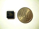 写真はステッピングモータ制御用のLSIで、日本パルスモータ製PCD4511です。QFP表面実装パッケージの44ピン、価格は1,600円です。このLSIは速度や回転ステップ数、加減速などに関する基本的なパラメータを書き込むだけで、簡単にステッピングモータを制御してくれる機能を持ちます。また、外部に設けるリミットスイッチや原点用スイッチなどを取り込んで強制的に停止させるなどの機能も持ちます。 |