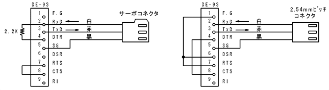 上図左がKONDO KHR-1純正のシリアルケーブルです。RxDとDTRの間を2.2Kオームの抵抗で接続していますが、力弥自身はこのような接続は始めて見ました。上図右が今回のSH2-7144Fマイコンボード上のパターンによる等価のシリアルケーブル配線ですので、このようなシリアルケーブルを自作されても問題ありません。力弥は通常、DTRとDSR、RTSとCTSをそれぞれショートさせて擬似的なハンドシェーク接続としています。いずれにしても、3ピンのうち、マイコンボード側から見れば、TxD,RxD,GNDの順番にピン配列が並べばよいことになります。