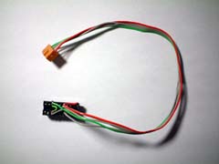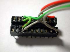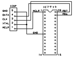PICライターからの信号線取り出しには、以下のようなケーブルを利用します。これはICソケットに線を強引にハンダ付けしてみました。配線図は以下の通りで、PICライター側にはPIC16F873と同じ条件でICソケットを挿し、片側はテスト基板のICSPコネクタに接続します。これで普通に書き込みができます。