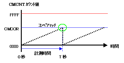 CMSTR(コンペアマッチタイマスタートレジスタ)のSTRビットを1にすることによってCMCNTはカウントを開始し、CMCORに設定されたコンペアマッチ値と一致したタイミングでCMCSRのCMF(コンペアマッチフラグ)が0(ゼロ)から1に変化します。つまり、CMFの状態を監視することによって、コンペアマッチ状態になったかどうかが分かります。なお、コンペアマッチによって、CMCNTのカウント値はゼロクリアされます。