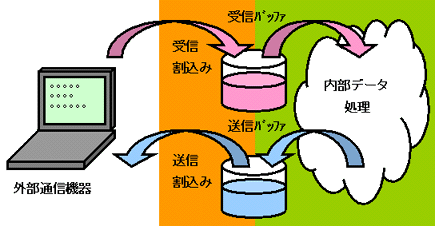 そこで、今回ご紹介するプログラムではメモリーを使ったバッファを経由させることにします。受信時には受信バッファを、送信時には送信バッファを経由して外部との通信を行います。バッファを経由させる利点は、受信時には内部処理に掛かる時間に関係なく、送信元からのデータを連続受信して蓄えることが可能で、送信時には送信速度に束縛されることなく、内部の送信処理を先に終了させて他の処理に移ることができるという点です。外部との直接のデータ送受信は割り込み処理に任せることで、main関数内の本来の処理を、好きなペースで進めることができるというわけです。
