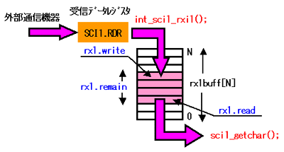 受信バッファのデータは、sci1_getchar();関数を使って読み出します。読み出しはrx1.readという構造体変数が示すアドレスによって行います。rx1.readの値もはじめは0から始まり、1文字読み出すごと(sci1_getchar();が実行される度)に+1されて行き、受信バッファの上限まで行ったら、再び0から読み出します。同時にrx1.remainの値を−1して、データ残量の値をひとつ減らします。ここで一つ約束事があり、rx1.remainが0より大きな値でないと読出しができないようにしています。つまり、受信バッファからの読出しは、受信バッファへの書込みを追い越すことができないということです。