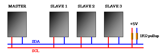 マスターを複数接続するマルチマスター機能というものもありますが、ここではマスターを1個とします。スレーブは複数接続することができます。スレーブになる各デバイスにはアドレス情報を持たせ、マスター側から送られてきたアドレス情報が自分のアドレスと一致したときだけ、データの送受信が出来る仕組みになっています。アドレスには7ビットアドレスモードと10ビットアドレスモードの2種類があります。通常は処理が簡単な7ビットアドレスモードで十分だと思いますが、このモードで最大127個までのスレーブを接続することができる計算になります。ただし、I2Cの通信方式は+5VにプルアップされたSDAとSCLの各信号線を、それぞれのデバイスがオープンドレイン等によるワイヤードオア接続で信号の操作と共有を行っている関係から、電気的にはあまり強い環境ではありません。なので、沢山のデバイスを接続したり、通信距離を長くしたりといったことには不向きなので、ハードウエアの構築には細心の注意が必要でしょう。