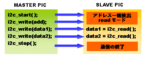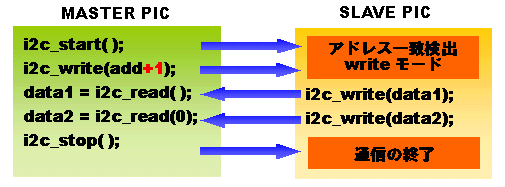 次に、指定されたアドレスを持つスレーブが、あらかじめi2c_write( )関数で準備しておいたデータをマスター側に送信します。ここでも、送信はマスター側のi2c_read( )関数1個に対して、スレーブ側のi2c_write( )関数1個のペアで1バイトずつ行います。