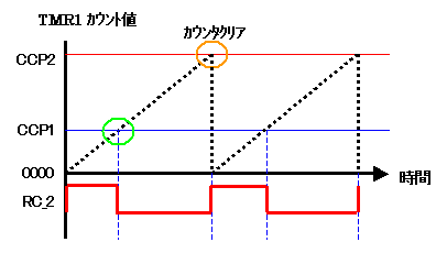TMR1タイマーカウンタを0x0000からカウントアップさせ、CCP1とCCP2にセットした値とのコンペアマッチで発生するそれぞれの割り込みを利用して、RCポート2の端子からPWM波形を出力させます。