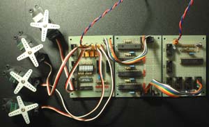左の写真が実験風景です。右がPICの実験基板、中央がI2Cの実験基板、左がI/O基板です。PICはすべて16F873を実装しており、右の基板のPICがマスター用で、中央の基板のPIC4個がスレーブ用です。スレーブ4個分のパルス出力が左の基板でコネクタ変換され、各サーボモータに接続されています。マスターとスレーブ間のケーブルは、1mのものでも安定して動作しました。 プログラムを実行すると、4個のサーボが同時に元気良く首振りを開始します。 |