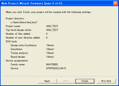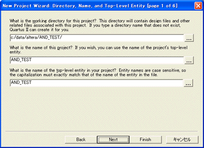 1−3. この窓では、以下の項目を指定します。 上段:プロジェクトを保存するフォルダ 中断:プロジェクト名 下段:作成するロジックのTop-Level Entity名 Top-Level Entityについては、VHDLのプログラミングに関係する部分ですので、次の機会にご説明します。 ここでは、全ての名前をAND_TESTという名前にしています。この名前は、作りたい機能に合わせて自分で付けます。 プロジェクト用のフォルダを予め作っておけば、[...]のボタンでフォルダ参照によって指定できるので楽です。 入力が終わったらNextボタンで先に進みます。