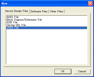 2−2. ここではVHDLファイルを作成するので、「Device Design Files」のタグの「VHDL File」を選択してOKボタンを押します。 |