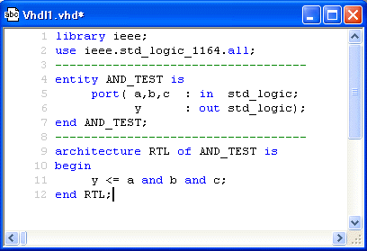 2−3. では、テキストエディタで左のようなソースファイルを入力してみましょう。面倒な人は、ここをクリックするとダウンロードできます。and_test.vhd ダウンロードしたらお手持ちのテキストエディタで開いて、コピーアンドペーストで貼り付けて下さい。 ちなみにこのVHDLプログラムは、 a , b , c の3つの入力端子のANDを、yの出力端子から出力するというものです。 上から3行目の entity AND_TEST is の「AND_TEST」がここでのTop-Level Entity名 となります。プロジェクト作成の際に指定したTop-Level Entity名 と同じ名前でないと、コンパイルの際にエラーになるので注意して下さい。