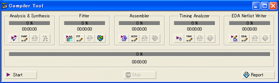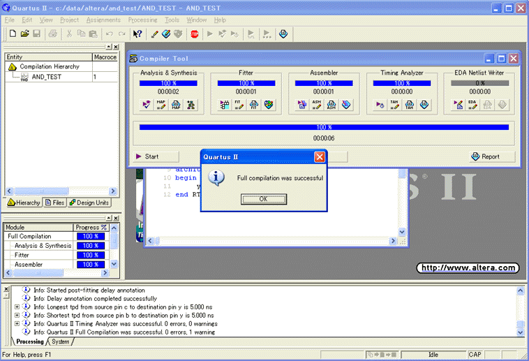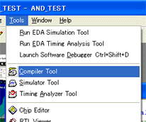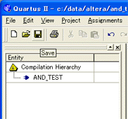 さて、作ったVHDLのソースファイルを、一度コンパイルしてみましょう。間違いがあればエラー表示されますし、構文的に間違いがなければエラーは発生しません。(思った通りに動くかどうかは別ですが...) また、VHDLソースファイルという単なる文字列を、意味のある情報としてQuartusⅡに認識させるという意味でも、コンパイルが必要なようです。