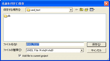 2−5. セーブするときには、予めプロジェクトフォルダが設定されているので、そのまま「保存」ボタンを押して保存します。 これでVHDLファイルの作成は終了です。 |