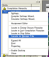 2−6. 一度VHDLファイルが作られると、メイン画面上の左側に作成されたTop-Level Entity名を右クリックしてポッポアップメニューを開き、Locate in Design File を選べば、VHDLファイルを開くことができます。 File → Open から開くよりも楽に操作できます。 |
