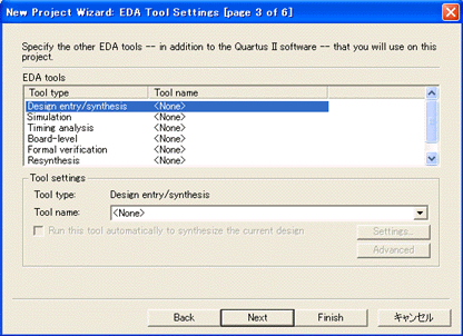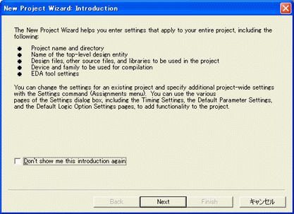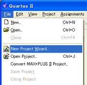 QuartusⅡWebEditionでは、ひとつのロジックを開発する経緯で生成される複数のファイル類を、プロジェクトという枠でまとめて管理します。先ず最初にプロジェクトという入れ物を作り、その中で作業を進めていくという考えです。では、そのプロジェクトの作成から始めてみましょう。