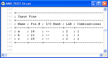 3−5. レポートはテキスト文字形式で表示されます。色々な情報が表示されますが、ここではInput Pinsというところを見てみましょう。これは、VHDLソースファイルで宣言した、a,b,cの各入力端子が、CPLDデバイスの何番ピンに割り振られたかを表示しています。 ここではa,b,cの各ピンは、それぞれ24,21,25番ピンに割り振られたことを示しています。この割り振りは勝手に行われます。 |