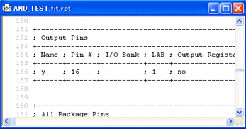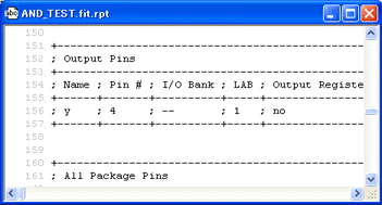 3−6. 今度は、同じFitter Reportの中のOutput Pinsというところを見てみましょう。これも同様に、VHDLで宣言した出力端子yが、CPLDデバイスの何番ピンに割り振られたかを表示しています。ここでは4番ピンになっているようです。 |