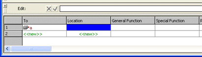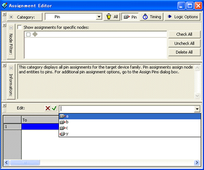 4−2. 左のような窓が開きます。ここで、VHDLのソースファイルで宣言した端子を、実際のCPLDデバイスのピン番に割り当てていきます。 窓最上段のCategoryの中から、Pin ボタンをクリックし、窓最下段のEditの表の中から、Toの列の<<new>>をクリックしてハイライトさせておきましょう。