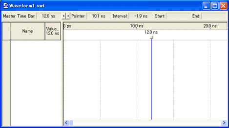 5−12. さて、シミュレーションしたい端子の登録が終わると、波形表示用の画面に端子が現れました。波形表示エリアには、初期状態として出力信号はハッチング状態、入力信号は無信号状態になっています。 では、ここに入力信号を書き込んでみましょう。 |