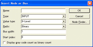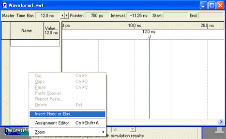 5−4. 先ずはじめに、シミュレーションしたい出力端子と、波形入力させたい入力端子を登録します。窓の中の左側の枠(Nameと表題が付いている下側の白い枠)を右クリックすると、ポップアップメニューが開くので、Insert Node or Bus を選択します。 |