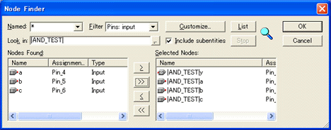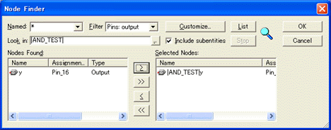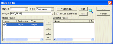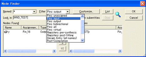 5−6. 左のような窓が開き、Filter欄がPins outputになっています。 また、Look in欄が今回のEntity名のAND_TESTになっていることも確認しておきましょう。 ここで、Listボタンをクリックします。