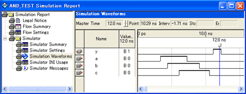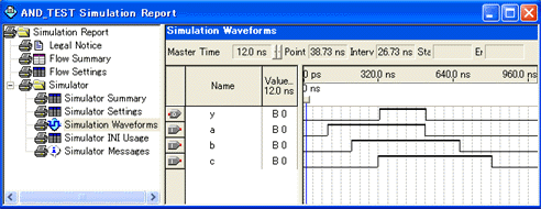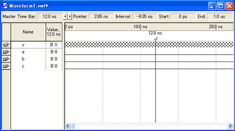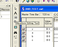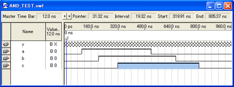 5−15. 今回は、左のような入力波形を書き込んでみました。今回のロジックは、 y = a AND b AND c なので、a , b , c の3個の入力波形が全て1(high)の状態の時だけ、y 信号の出力も1になるはずです。では、本当にそうなるかどうか、早速シミュレーションを実行してみましょう。