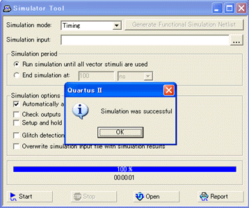 5−16. 一番初めに開いたSimulator Tool窓のStartボタンを押してください。シミュレーションが開始されます。終了すると、左のように成功したことを示す確認窓が開きます。成功したらReportボタンを押します。