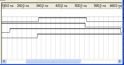 5−21. シミュレーション結果の時間軸をもう少し引き伸ばしてみましょう。一番上の出力信号に遅延があるのが分かります。プロジェクト作成の際にデバイスの種類を特定しておくことにより、そのデバイスの持つ内部遅延量をシミュレーションに反映させることが出来るのです。